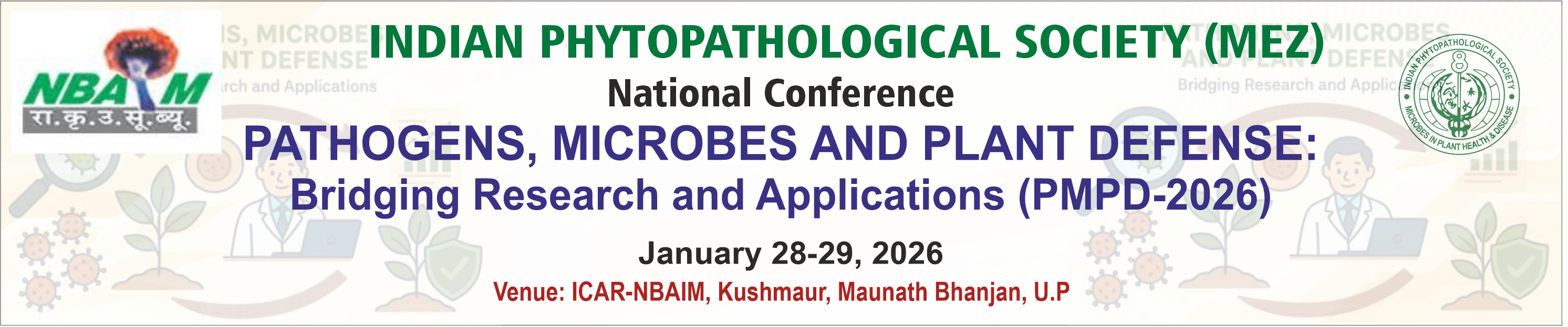 On behalf of the ICAR–National Bureau of Agriculturally Important Microorganisms (NBAIM), Mau and the Indian Phytopathological Society (IPS), New Delhi, we are delighted to invite you to participate in the National Conference & IPS Mid-Eastern Zonal Meet on Pathogens, Microbes and Plant Defense: Bridging Research and Applications (PMPD-2026); 28-29 January, 2026, at ICAR–NBAIM, Kushmaur, Maunath Bhanjan, Uttar Pradesh – 275103. This two-day event will provide a vibrant platform for scientists, academicians, students, and industry stakeholders to deliberate on recent advances in plant–microbe interactions, disease management, and translational applications of microbial research in agriculture. The scientific program will feature plenary lectures, invited talks, oral and poster presentations, and interactive sessions, focusing on: Emerging pathogens and plant defense mechanisms; Microbial ecology and functional genomics; Innovations in microbial technologies for sustainable crop protection; Translational research and applications for farmers and industries. We cordially invite you to contribute through abstract submission, research presentations, and active participation, and join us in bridging fundamental research with practical applications for sustainable agriculture. Chief Organizing Secretary Dr. Harsh Vardhan SIngh, Principal Scientist and Zonal President, IPS-MEZ