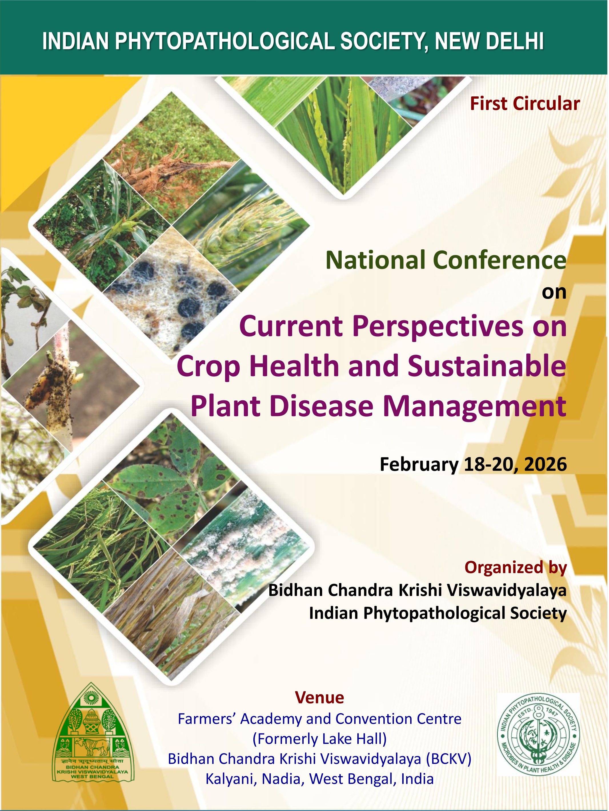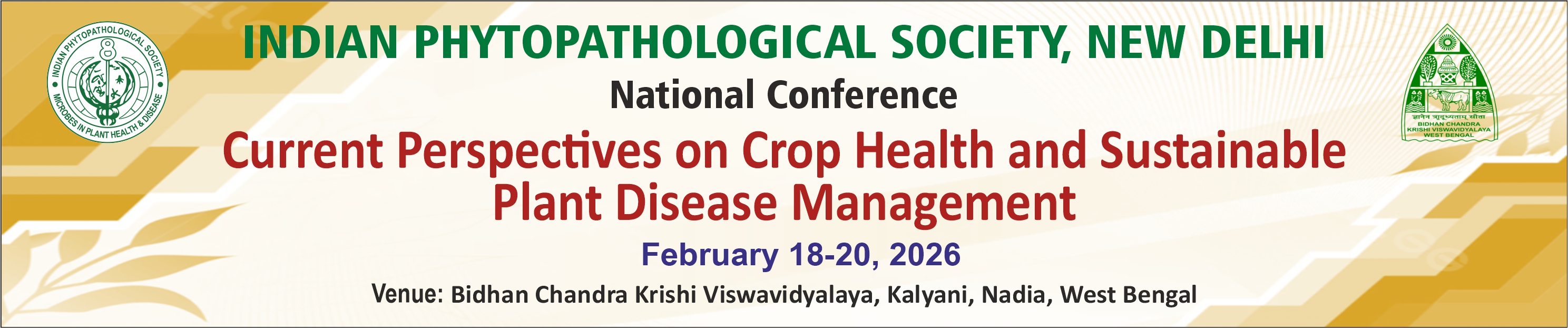 Dear Esteemed Members! Greetings from the Indian Phytopathological Society (IPS)! We are happy to inform you that Bidhan Chandra Krishi Viswavidyalaya (BCKV), Kalyani, Nadia, West Bengal and Indian Phytopathological Society, New Delhi is organizing a National Conference on “Current Perspectives on Crop Health and Sustainable Plant Disease Management”, at BCKV, Kalyani, Nadia, West Bengal during February 18-20, 2026. The conference aims to bring together leading scientists, researchers, academicians, industry experts, and policymakers from around the world to exchange ideas and foster collaborative efforts in the field of plant health and sustainable disease management. In light of growing global challenges such as climate change, emerging pathogens, and food insecurity, the conference will focus on innovative strategies and integrated approaches to ensure resilient and sustainable agricultural systems. The scientific program will include keynote addresses, plenary lectures, award lectures, panel discussions, oral and poster presentations on a wide range of themes in the National Conference. We would be honoured by your presence and contribution to this significant event, and we sincerely hope you will join us in BCKV to share your valuable insights and expertise. We look forward to your gracious presence and active participation in making this National Conference a grand success. With warm regards, Dr. Jayanta Tarafdar, Organizing Secretary